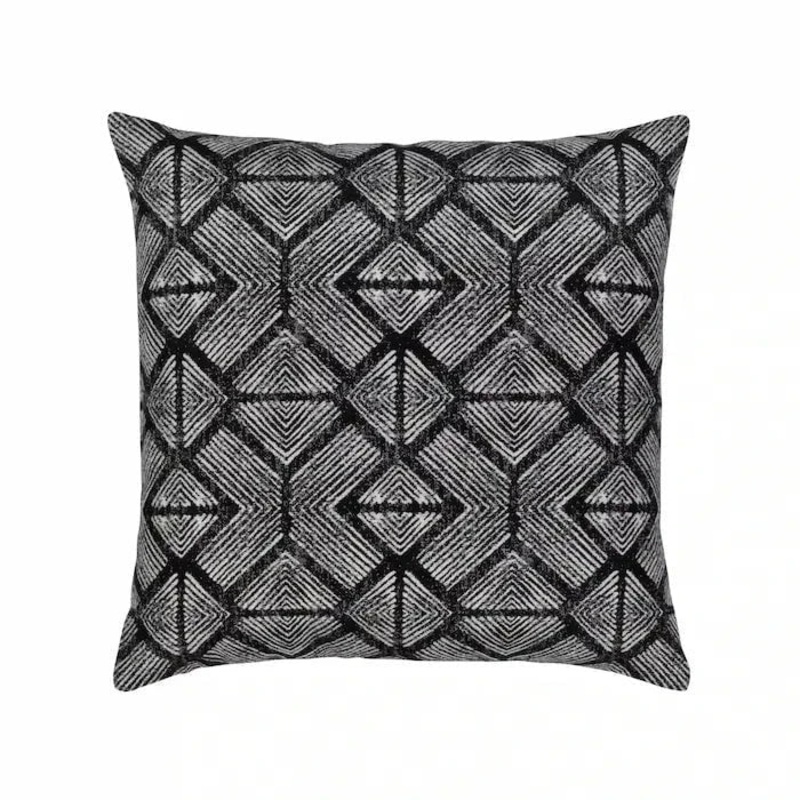 The Elaine Smith Bakuba Ebony 20" Square Pillow draws inspiration from traditional African textiles, featuring a bold geometric pattern in deep ebony tones. This striking design adds global elegance and texture to any space. Made from durable, weather-resi