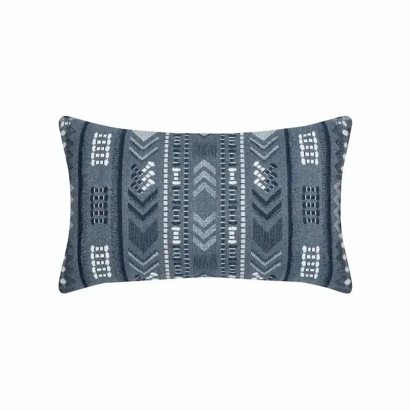 Featuring an exotic pattern that brings a fresh sense of cultural connection, this pillow showcases a soft palette of denim tones. Made with outdoor-safe materials, its an ideal choice for global-inspired decor. Sized at 12" x 20" in a lumbar shape, it com