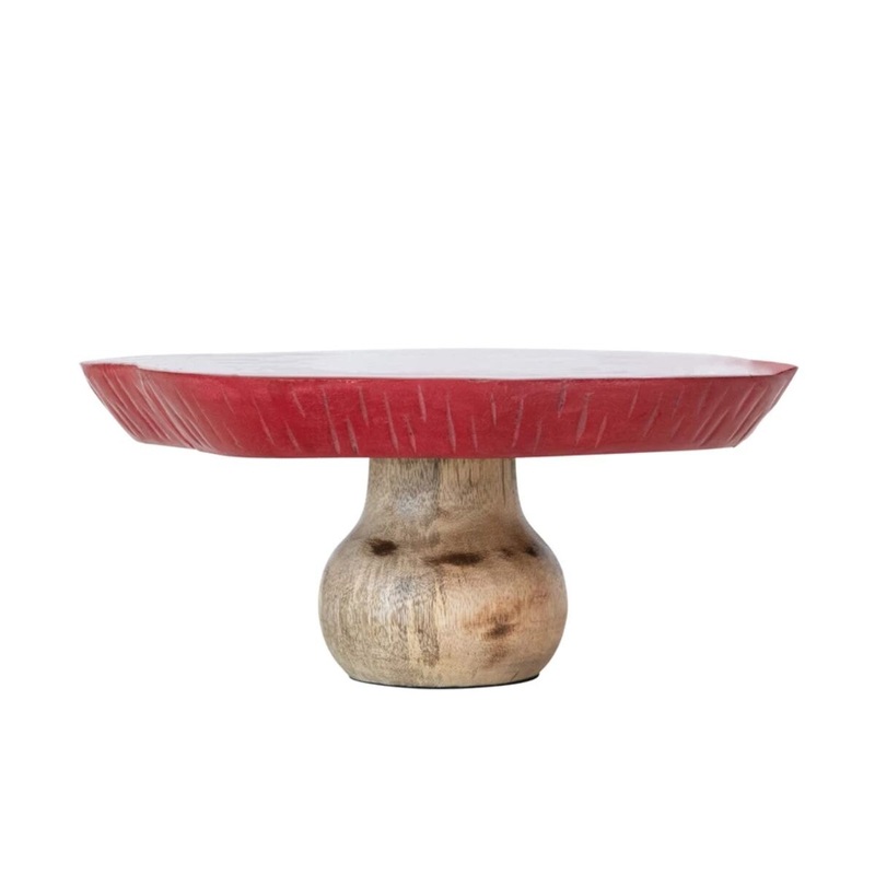 Enameled Mango Wood Mushroom Shaped PedestalThis whimsical enameled mango wood mushroom-shaped pedestal is a charming addition to any home decor. The vibrant red and white enamel top contrasts beautifully with the warm, natural wood grain of the stem, crea