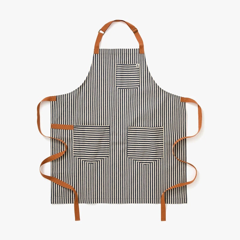 The Essential Apron in Palm combines navy and white stripes with ochre-toned straps for a stylish, modern look. Its offset striped pockets add a sophisticated, artistic touch that elevates any kitchen outfit. Crafted from durable 12oz heavyweight 100% cott