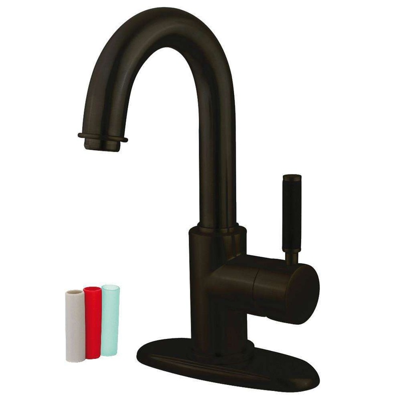 This faucet tastefully interweaves top-notch ergonomic design and the sheen of contemporary simplicity with its black silicone rubber coated handles and cylindrical facets. Single-hole bathroom faucets with optional deck plates are ideal for smaller bathrooms and feature an easy 1 or 3-hole installation. Remove the deck plate for an ease of cleaning and more streamlined design. The Kaiser single-handle bathroom faucet with push pop-up and cover plate and its featured sturdy brass construction and premium oil rubbed bronze finish are guaranteed to glamorize your home’s modern ensemble for years to come. Furnish your home surrounding with the modern flair of this fixture. A matching finish drain is also included.