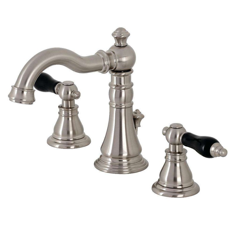 Crafted in commendations to English nobility, the exemplary design of this faucet manifests regality and elegance with its black porcelain handles. Ideal for more spacious bathrooms, widespread faucets are more spread apart and feature a 3-hole installation. The Duchess widespread bathroom faucet with pop-up drain and its featured sturdy brass construction and premium brushed nickel finish are guaranteed to glamorize your home’s traditional ensemble for years to come. Glamorize your home today with the traditional elegance of this faucet. A matching finish drain is also included.