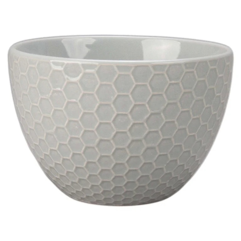 Discover the perfect blend of style and function with the Honeycomb Bowl. Made from high-quality glazed porcelain, this 5.5" bowl features a neutral grey color and a textured honeycomb pattern around the rim. Its durable surface resists cracking and staini