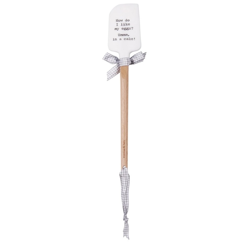 A double-sided silicone spatula that features a vintage photograph on one side, and “How Do I Like My Eggs? Umm, In A Cake!” sentiment on the other side. Logo is engraved into wooden handle for added interest and includes a decorative gray and white gingham bow and ribbon for hanging.