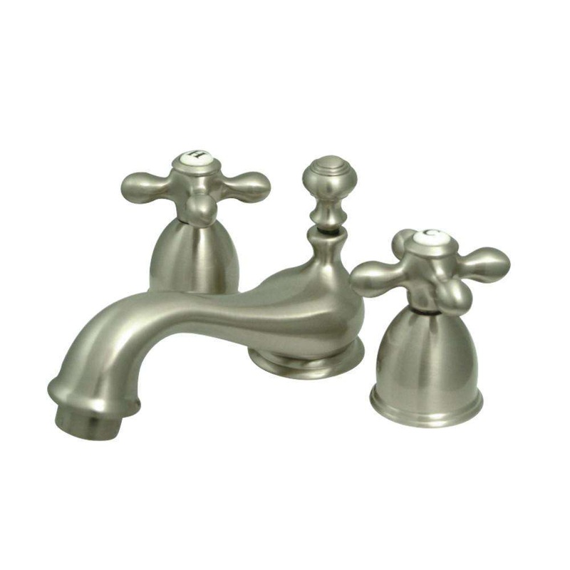 Return to the antique designs of the early 20th Century with this faucet, offering detailings of refined splendor and ornate design to your home. Emulating the widespread look, mini-widespread bathroom faucets are for those that love detailed facets and clean lines. These compact faucets provide all of the design elements of a quality faucet without the need for a deck plate in 3-hole sinks. The Vintage Mini-Widespread Bathroom Faucet and its featured sturdy brass construction and premium brushed nickel finish are guaranteed to glamorize your home’s traditional ensemble for years to come. Let this faucet bring about an air of traditional allure to your interior home design. A matching finish drain is also included.