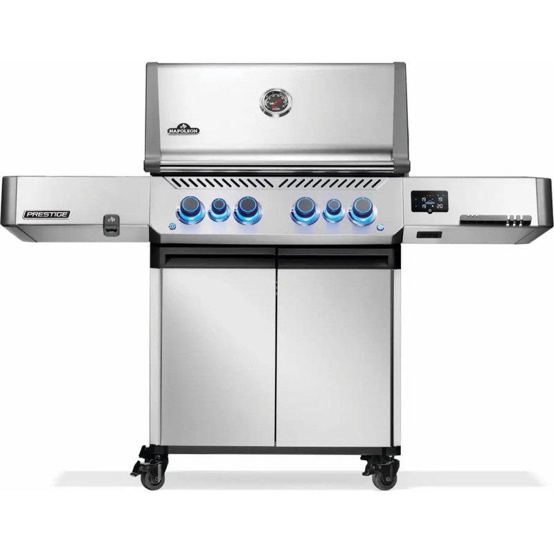 Upgrade your gas grill with the Napoleon Prestige 500 Connected Gas Grill. With Wi-Fi and Bluetooth connectivity, you can easily monitor temperatures, set timers and receive high-temperature warnings all from your phone. The LCD display and temperature probes ensure precise BBQ, while the infrared sear station and larger rotisserie burner enhance performance. LED Control Knobs with SafetyGlow technology add a touch of safety and style.