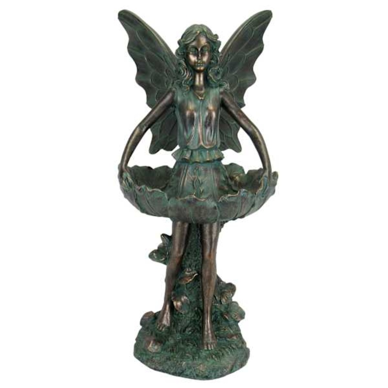 Uniquely designed like a garden fairy to invite birds for a snack, our resin bird feeder combines simplicity with nature. The realistic natural, green and coppery finish makes this bird feeder the perfect addition to any garden setting. it's easy to place